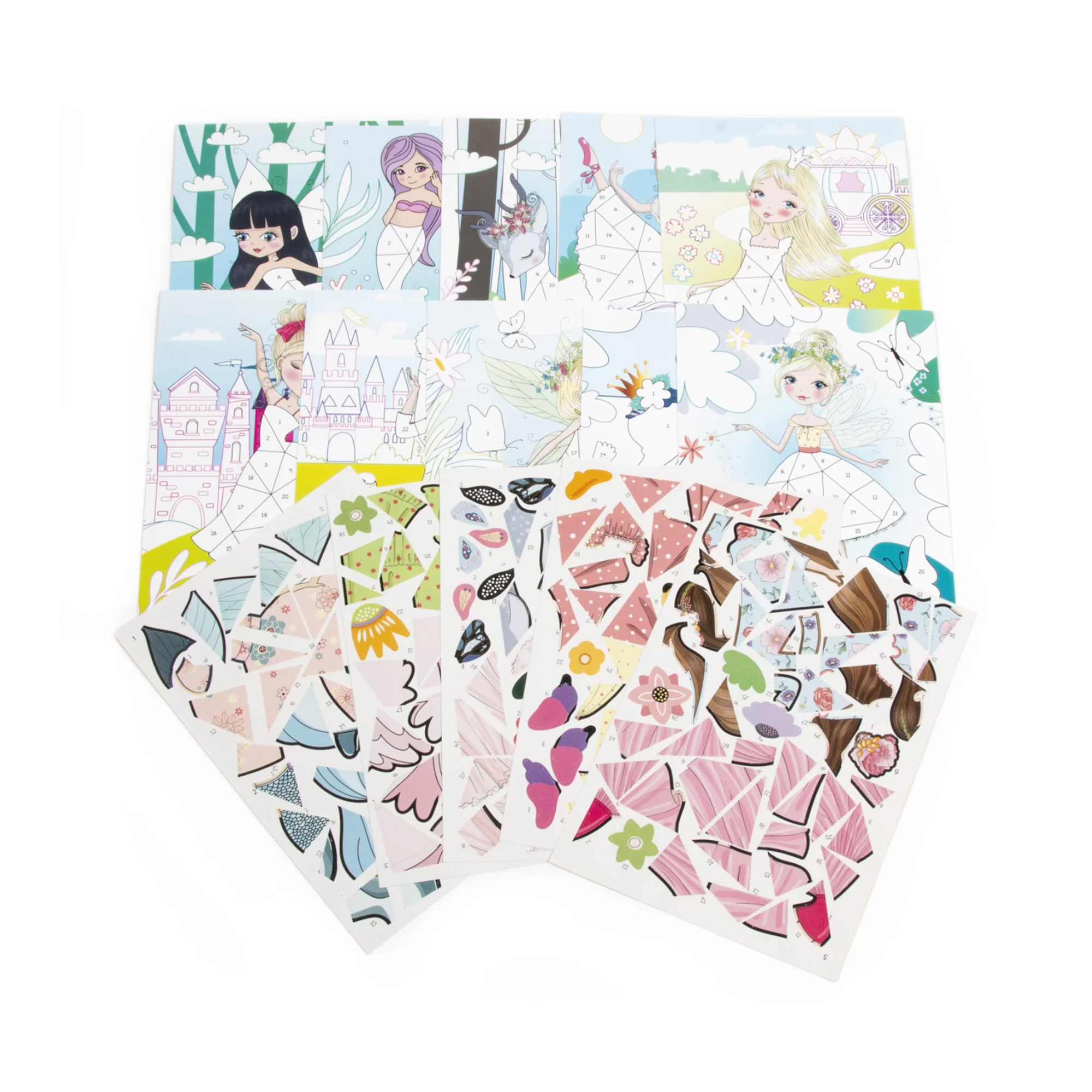 - 10 arkuszy do wyklejania: Każdy arkusz to unikalny wzór, który możesz wypełnić kolorowymi naklejkami