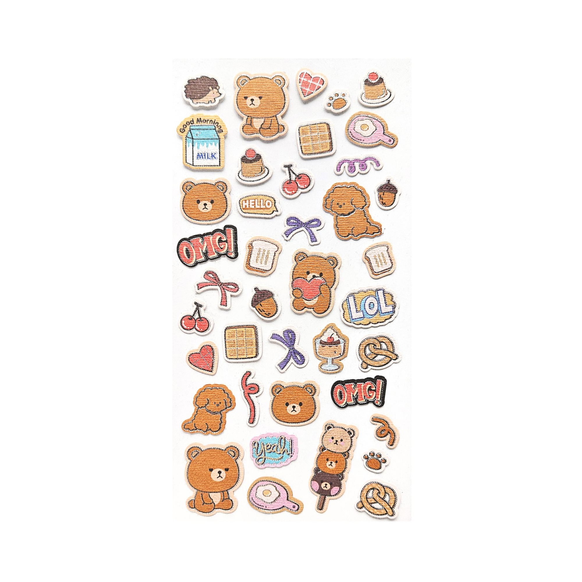 - Arkusz zawiera różnorodne atrybuty, takie jak słodkie desery, precle, wisienki, jajka sadzone oraz napisy "OMG!" czy "LOL", które pozwalają na tworzenie zabawnych i spójnych kompozycji.