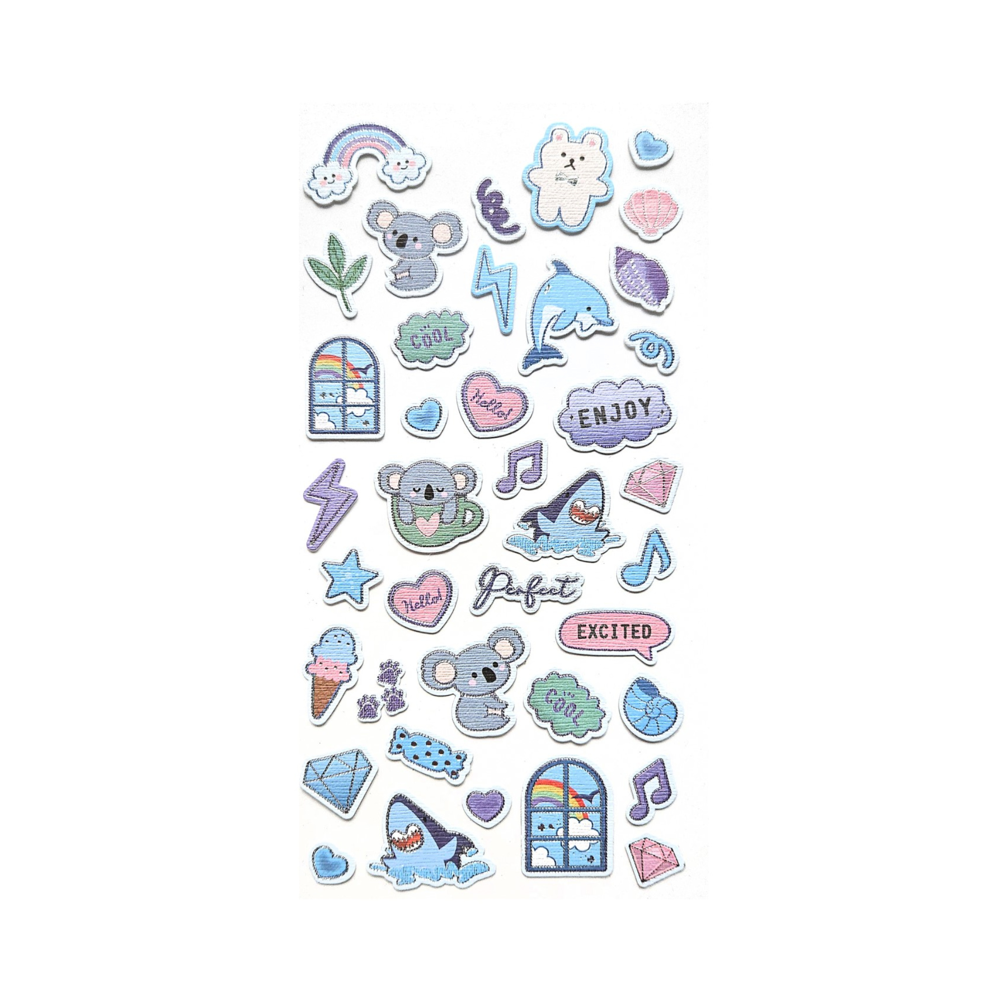 - Arkusz zawiera różnorodne atrybuty, takie jak muszelki, tęcze, lody, nutki oraz diamenty, a także napisy "Perfect", "Enjoy" czy "Excited", pozwalające na tworzenie unikalnych kompozycji.