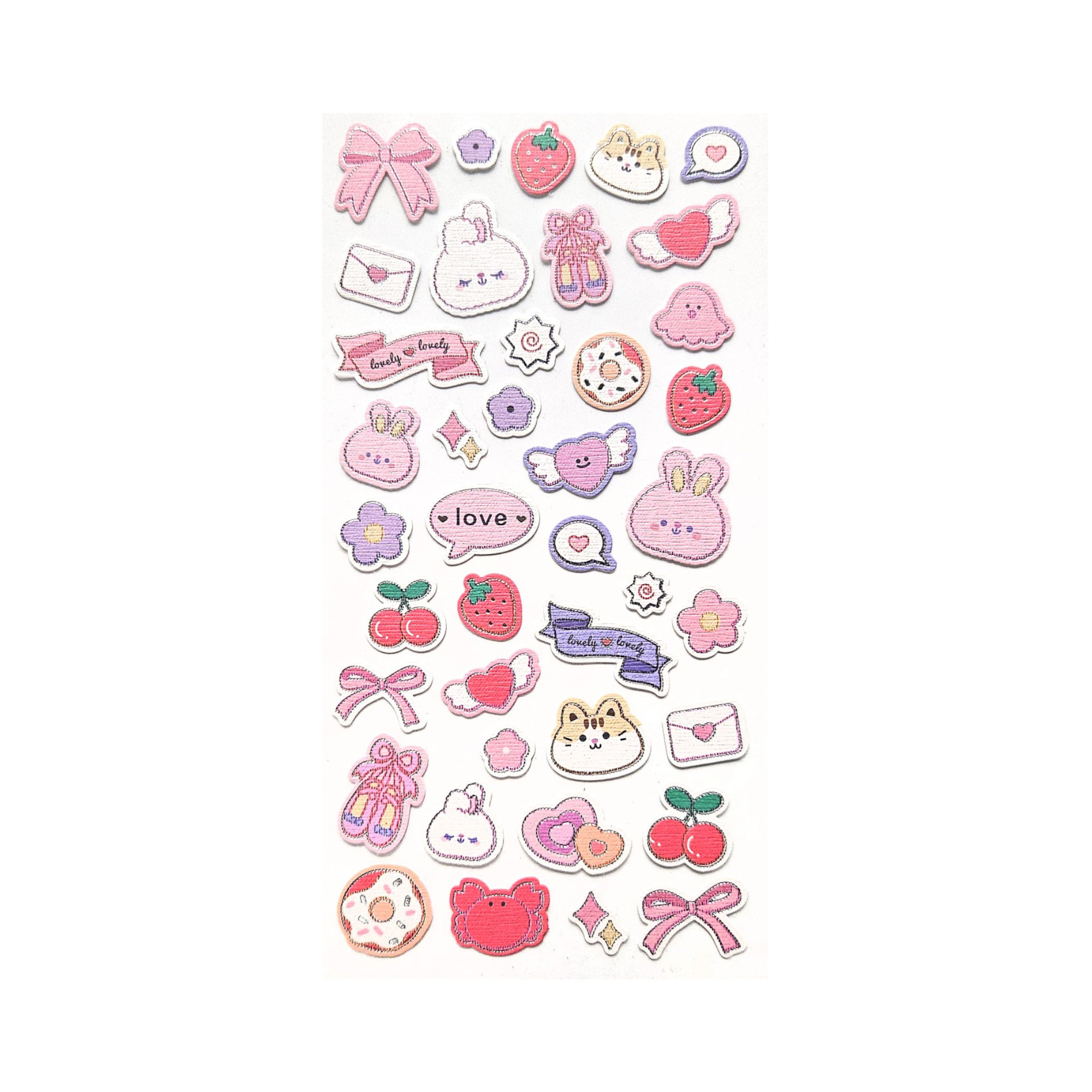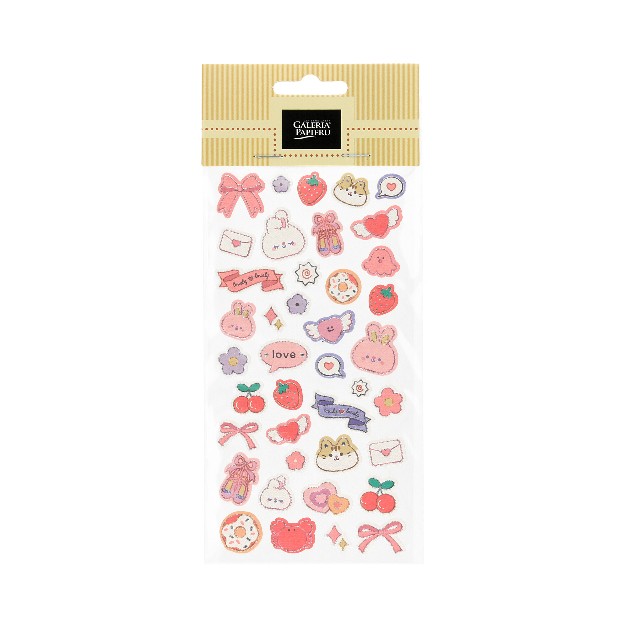 - Arkusz zawiera różnorodne atrybuty, takie jak truskawki, wisienki, donaty, serduszka ze skrzydełkami oraz napisy "Love" i "Lovely", które pozwalają na tworzenie spójnych dekoracji.