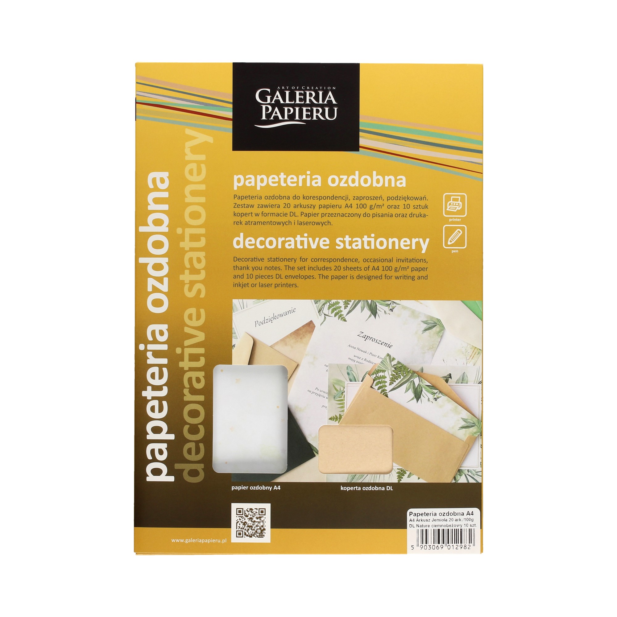 Zestaw papeterii Jemioła marki Galeria Papieru. Doskonała baza do przygotowania spójnej wizualnie, eleganckiej i estetycznej korespondencji. Zestaw składa się z arkuszy barwnych oraz kopert.