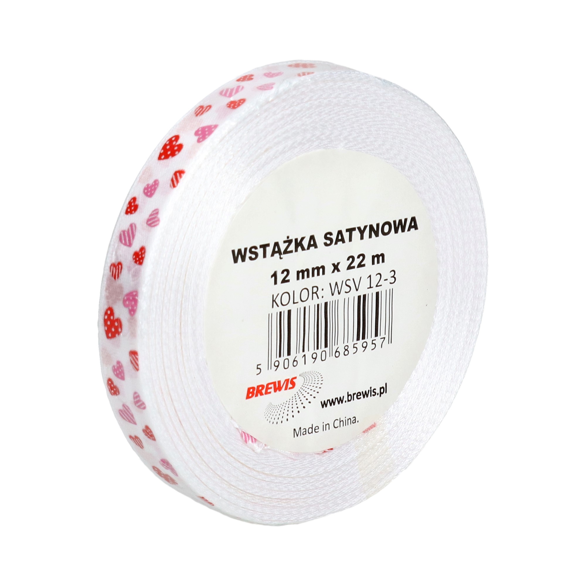 Wstążka satynowa Brewis 12mmx22m serca biała WSV12-3